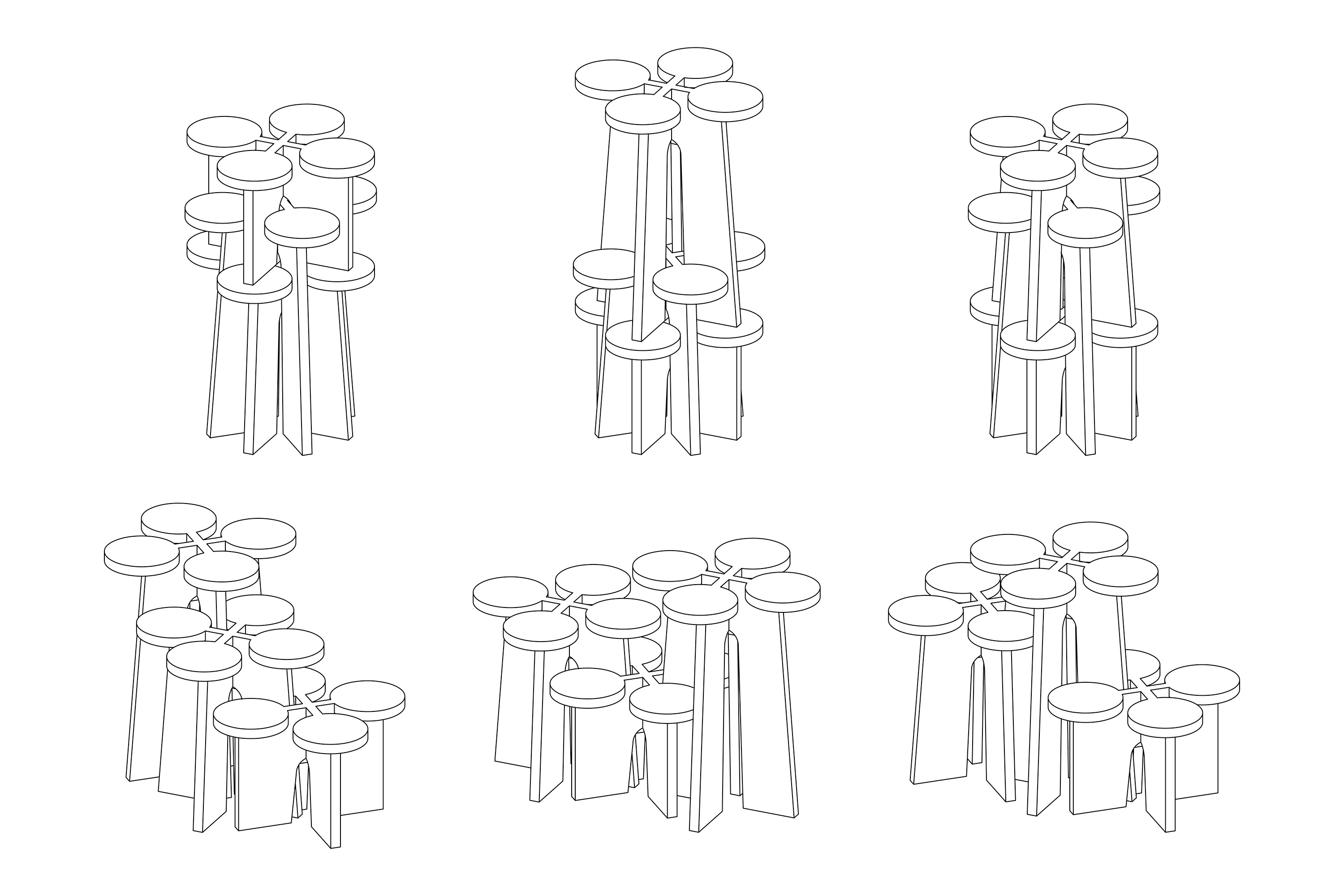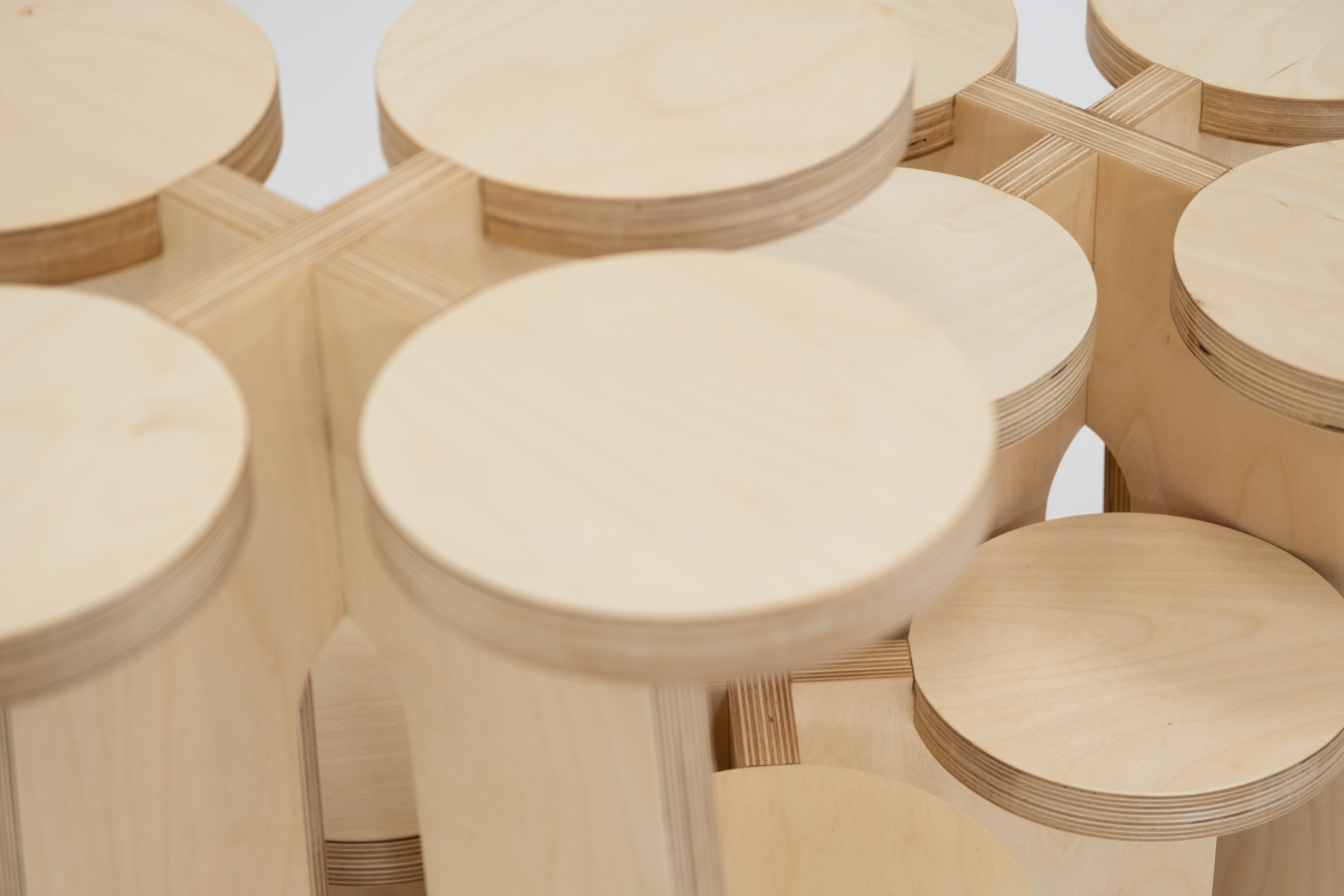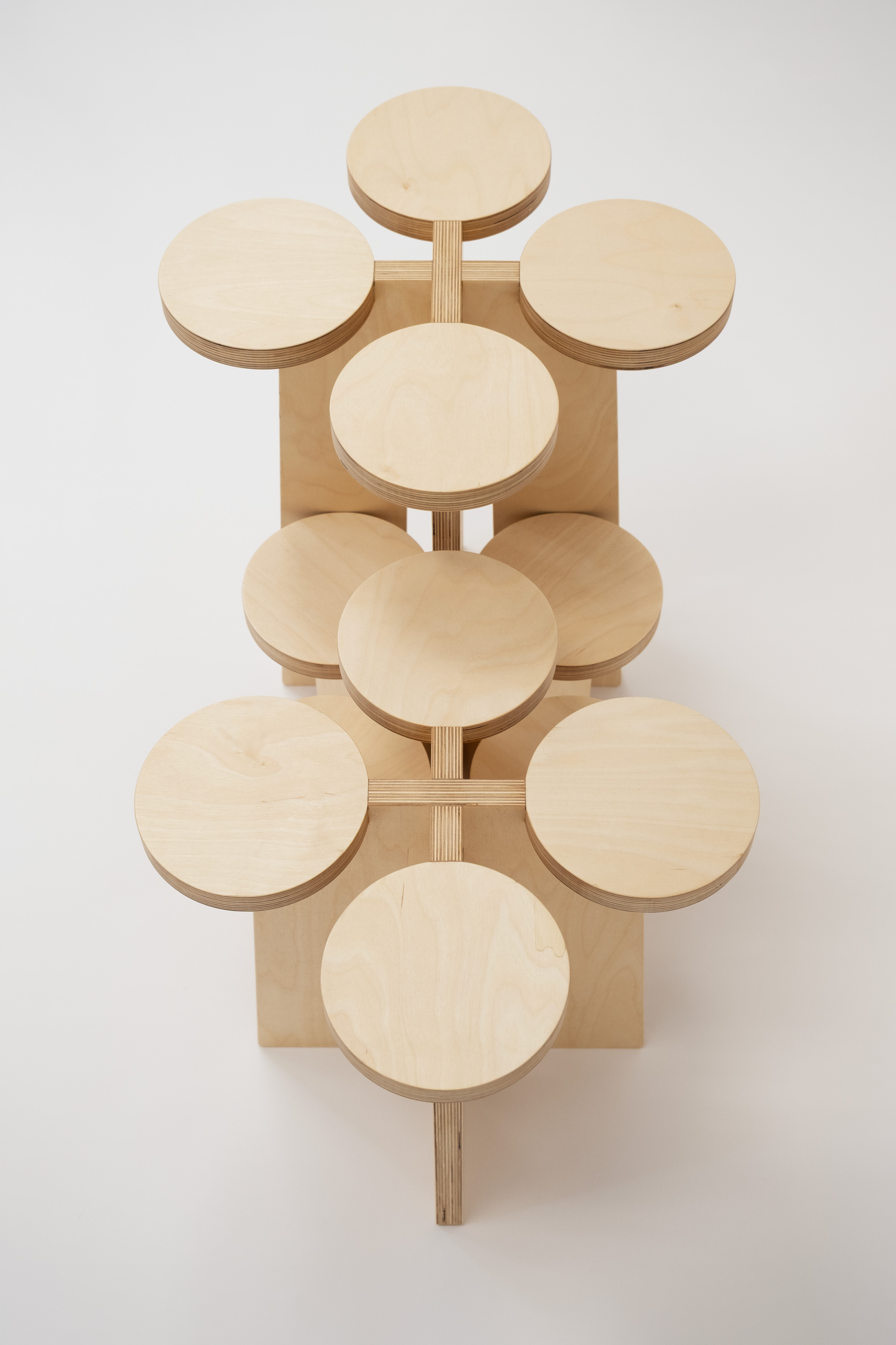 Inspired by fractal formations, Fractal System offers a set of non-directional, nestable objects that can be used as stools, stands, or shelves. There are multiple ways of stacking and intersecting these objects—different spatial relationships emerge, depending on the quantity and position one decides to employ.