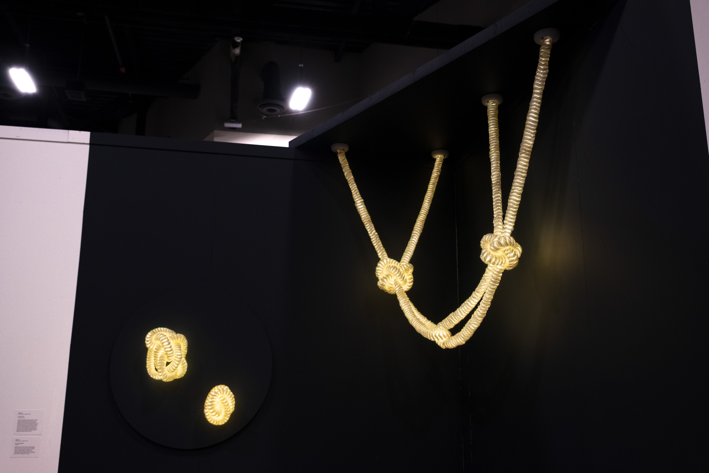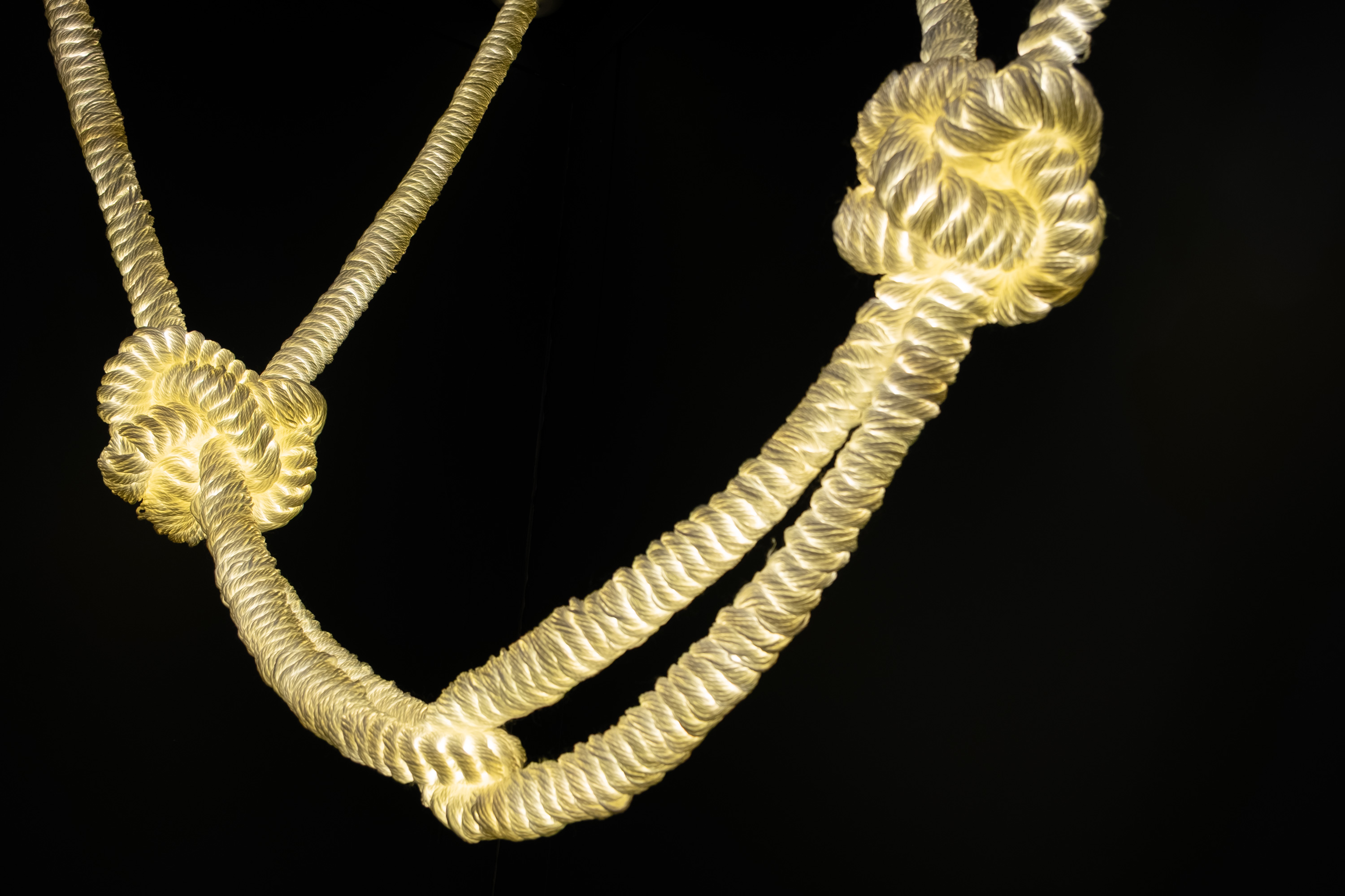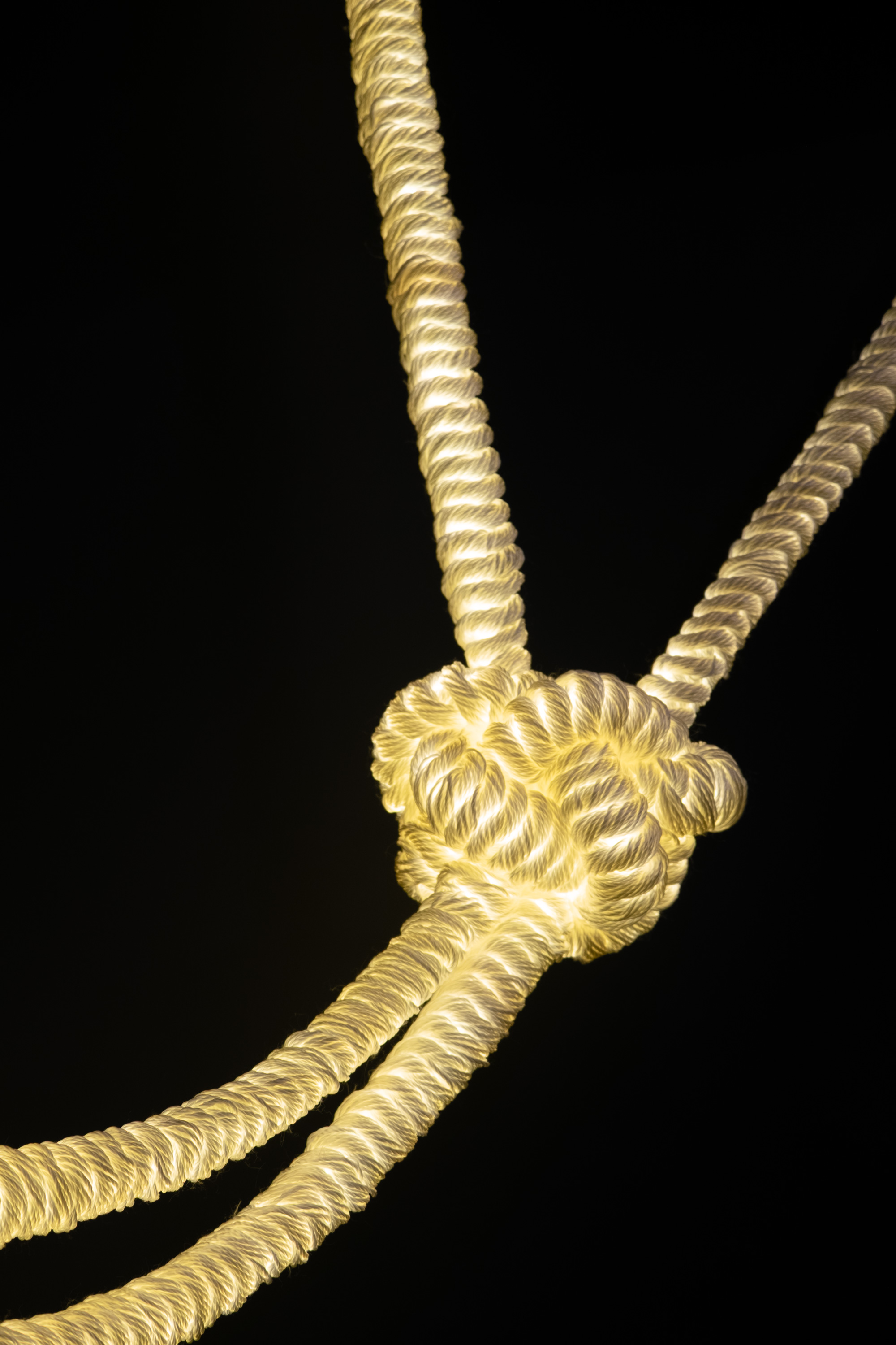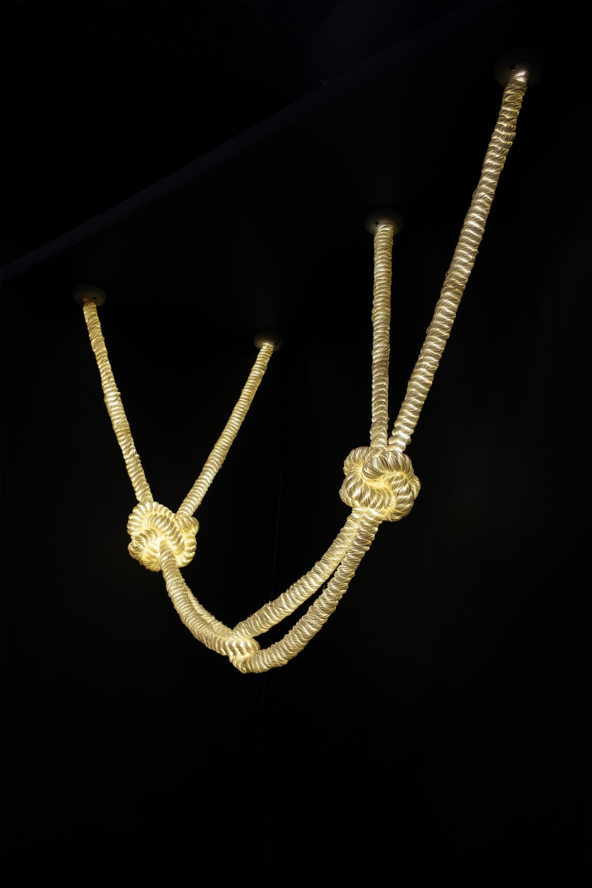 Knot Knot is a lighting collection based on multiple traditional Chinese knotting techniques. Various Chinese "Jie" (knot) types have been studied and applied to both functional and aesthetic aspects. The inner layer, structured with the Chinese JinGang Knot, serves a functional purpose by diffusing LED strips, while the outer layer, featuring the Chinese Double Connection Knot and Button Knot, enhances the aesthetic structure. This double-layered relationship explores structural recursion and unity, with formal repetition creating a self-aware object.