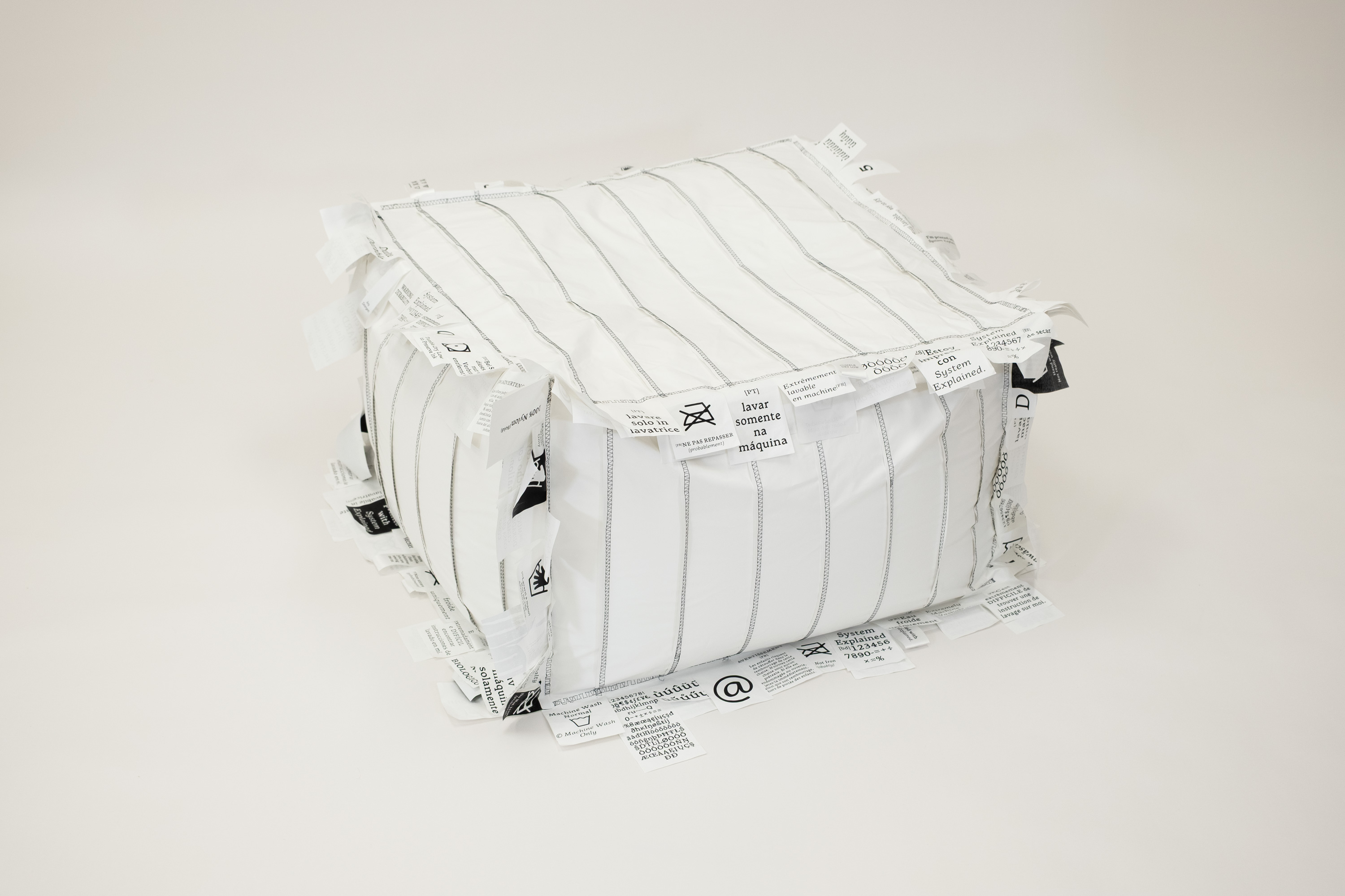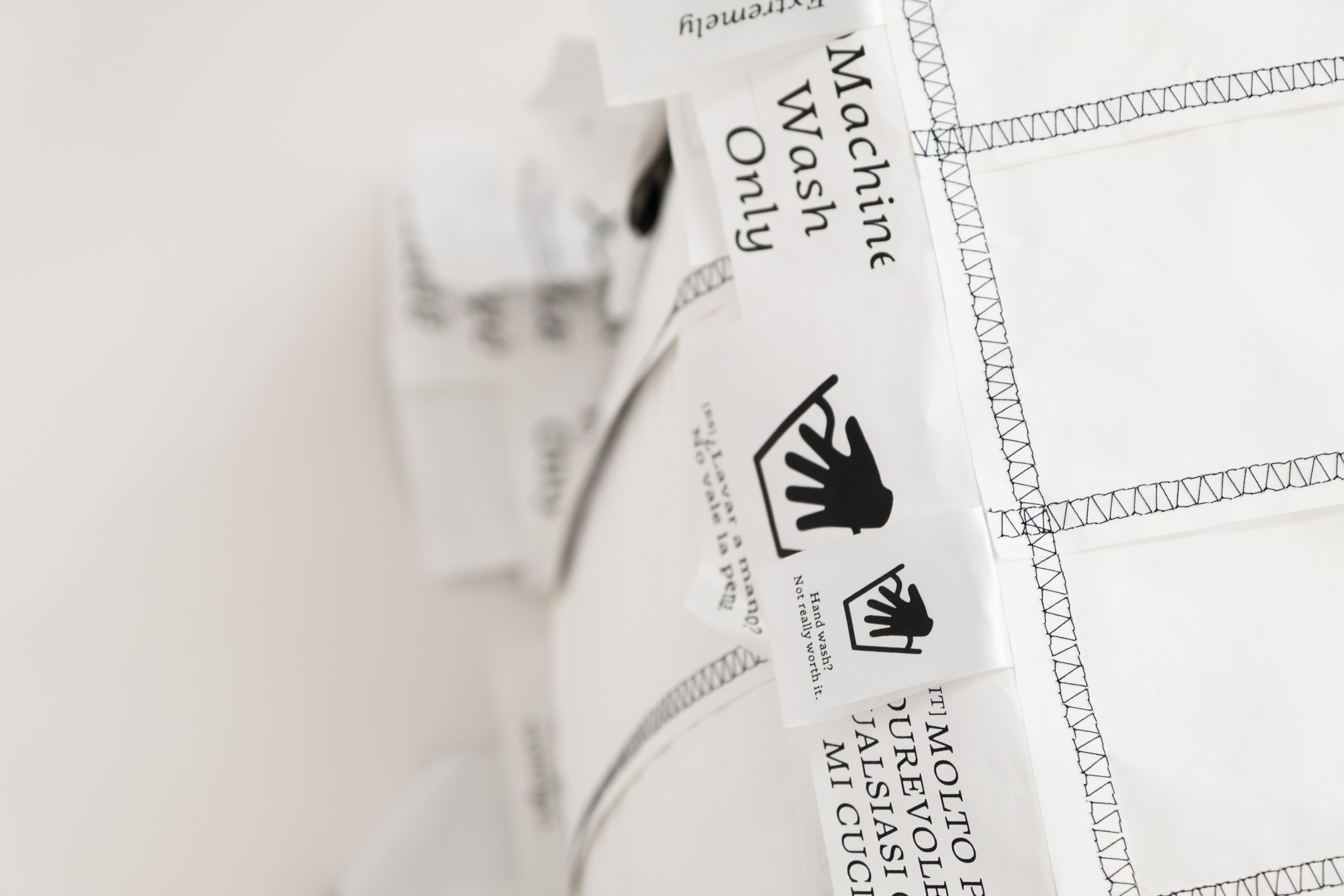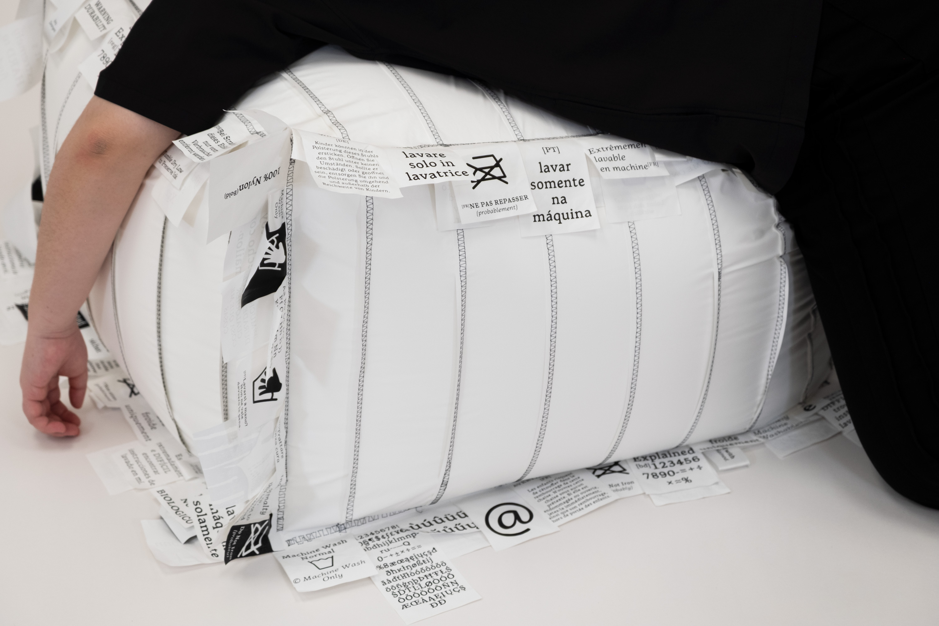 Machine Wash Only proposes a bean bag form with a cover made purely from the washing label material. The cover itself is an inside-out structure, with seams mapped out as a unique texture. The seam edges are flooded with information on washing instructions and the type specimen of the typeface, System Explained, which is also inspired by washing label characteristics. This object offers a self-referential creation with a material that has often been overlooked.
